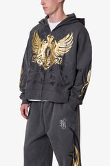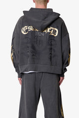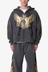The Gold Foil Tribal Hoodie is crafted from 100% cotton fleece with a weight of 380 gsm, offering durability and comfort. This boxy fit zip-up hoodie features a pigment dye and acid wash for a distinct worn look. Design highlights include screen-printed Y2K-inspired winged art and tribal motifs on the sleeves, accented with metallic gold details.