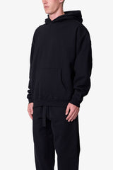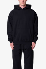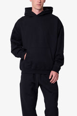 Constructed from 450 gsm cotton fleece with a garment wash, the Heavy Basic Hoodie features a relaxed silhouette with dropped shoulders and a kangaroo pocket. Designed with cover stitch detailing, a ribbed hem, and a self-lined hood.
