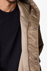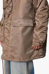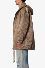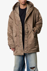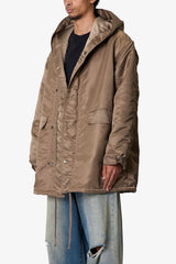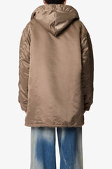 The Hooded Megaparka Jacket is constructed from durable 100% polyester with a relaxed fit. Designed with a drop shoulder, exaggerated hood, and adjustable hem, it features two front cargo pockets and dual snap and zipper front closure for functional layering.