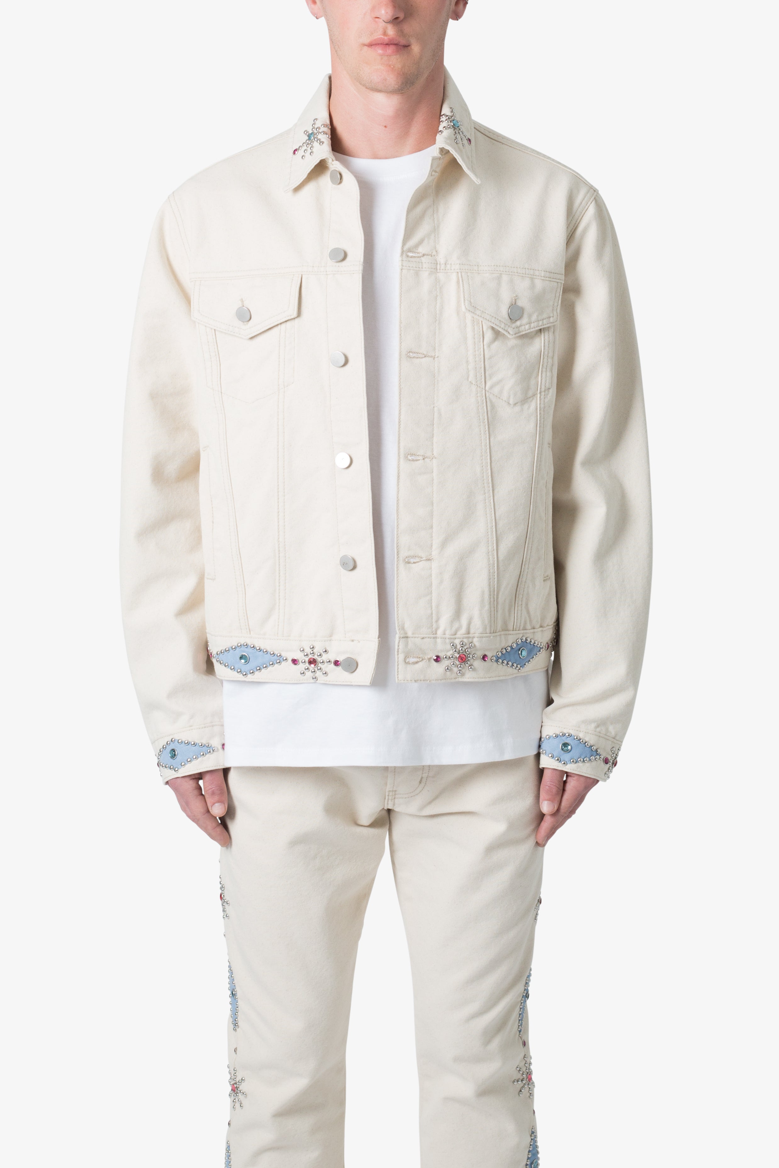 developed in Los Angeles, the Jewel Studded Trucker Jacket is designed with a standard fit and features a classic cut and details with jewel stud details throughout. The natural cotton denim base undergoes a vintage wash, that’s both visually striking and pleasing to the touch.