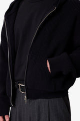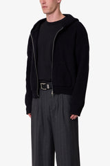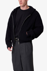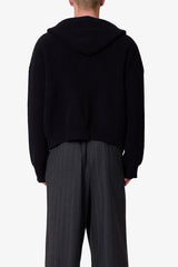 The Knit Zip Up Hoodie features a standard fit with a thick knit construction, ensuring durability and warmth. Designed with a full-length zipper for easy wear, it combines functional details with a modern aesthetic.