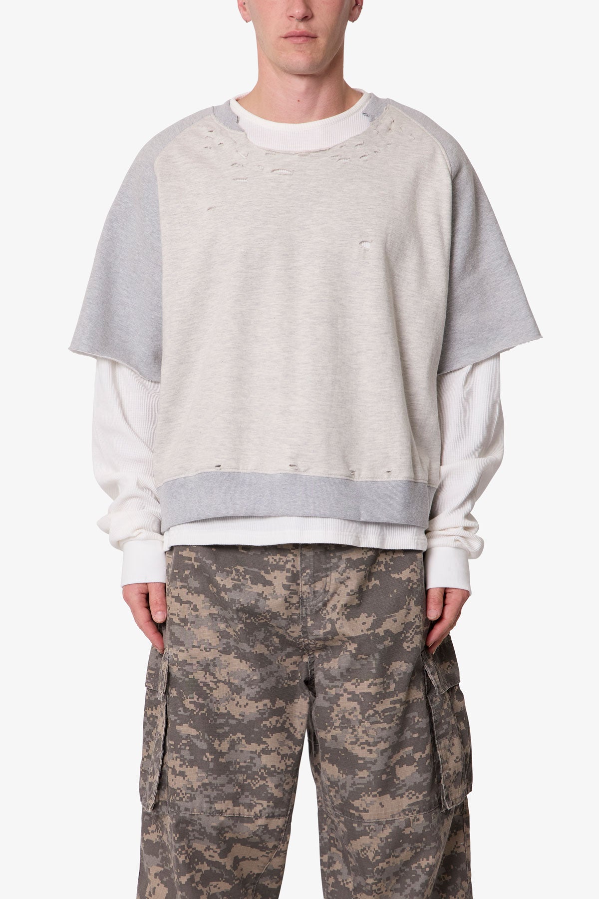 The Layered Thermal Raglan Sweater features a relaxed fit with a unique double-layer design. The contrasting raglan top layer is made from heavyweight cotton fleece, while the long sleeve under layer is crafted from soft cotton thermal. Heavy distressing and a vintage wash provide a worn-in look for an elevated style.