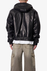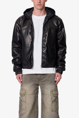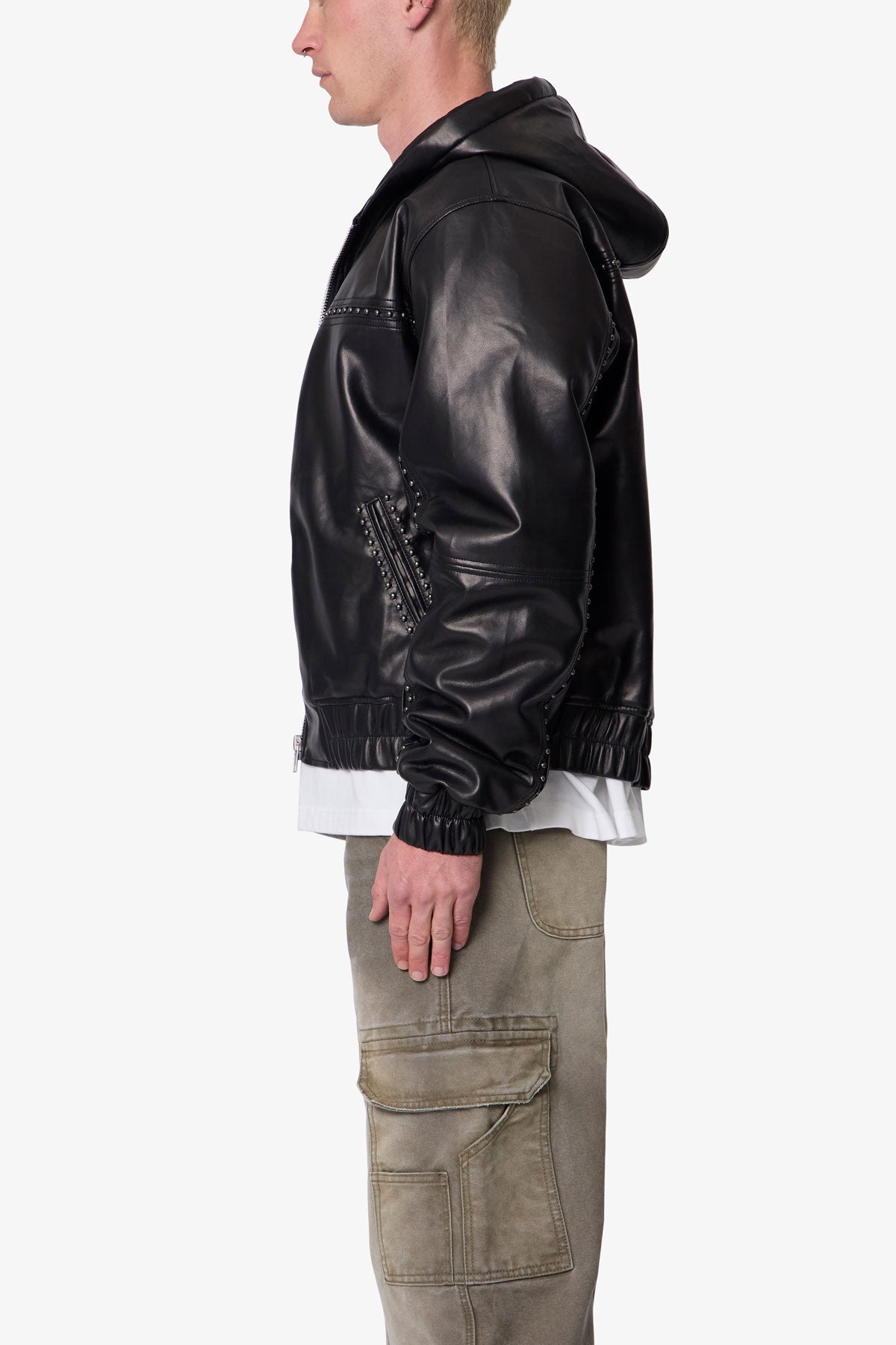 Constructed from durable faux leather with a quilted interior lining, the Leather Hooded Stud Jacket features a full front zip closure and paneled sleeves. Designed with metal stud appliqués on the yokes and sleeves, it incorporates a standard fit with an elastic hem and sleeve cuffs for added structure. Finished with side front pockets and an attached hood.