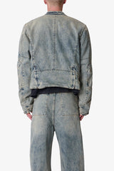 Constructed from 13 oz stone-washed blue denim, the Moto Denim Jacket features a cropped, slightly boxy silhouette. Designed with a minimal stand collar secured by a snap button, vertical zippered front pockets, and multiple panel seams throughout for a utilitarian structure. Finished with a full-length center front zipper and zippered cuffs.