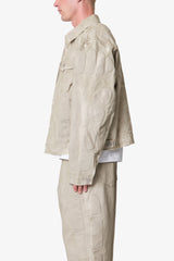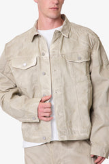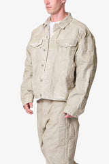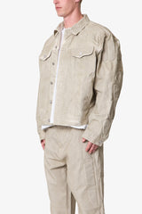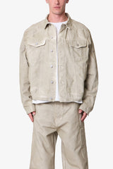 the Moto Trucker Jacket is designed with an oversized fit and features a cropped body, extended sleeves, button placket, and finished with padded moto inspired details on the shoulders and sleeves.
