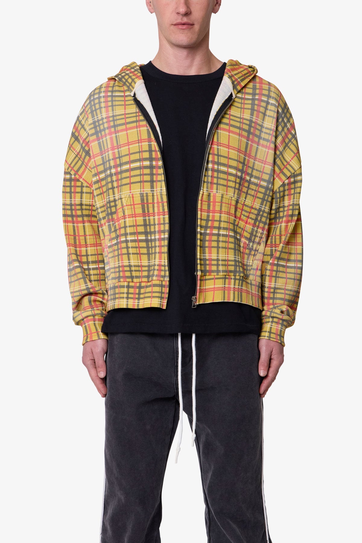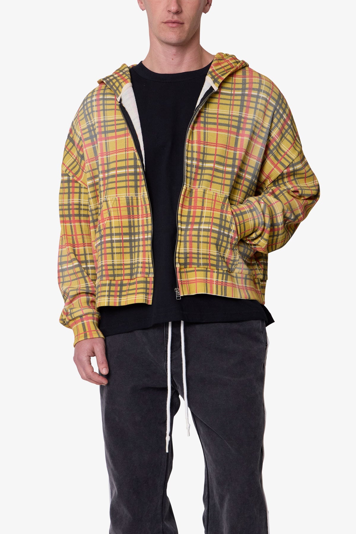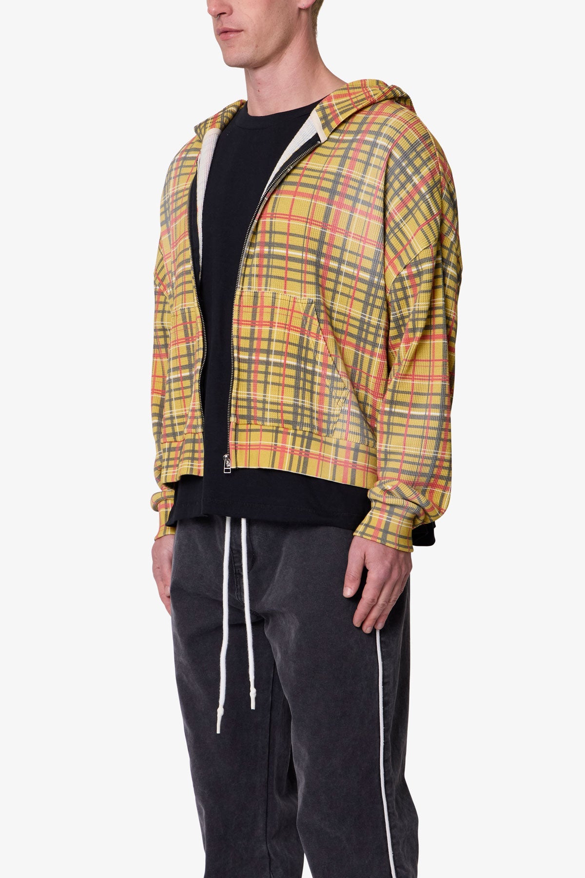 Constructed from 280 gsm cotton thermal, the Plaid Thermal Hoodie features a cropped, boxy fit with dropped shoulders and a slight crop at the waist. Designed with an all-over printed plaid graphic, this zip-up hoodie is finished with a heavy vintage wash and light pp spray for a worn-in effect and enhanced softness. Ribbed cuffs and hem provide structure, while kangaroo pockets and a full-length zipper add utility.