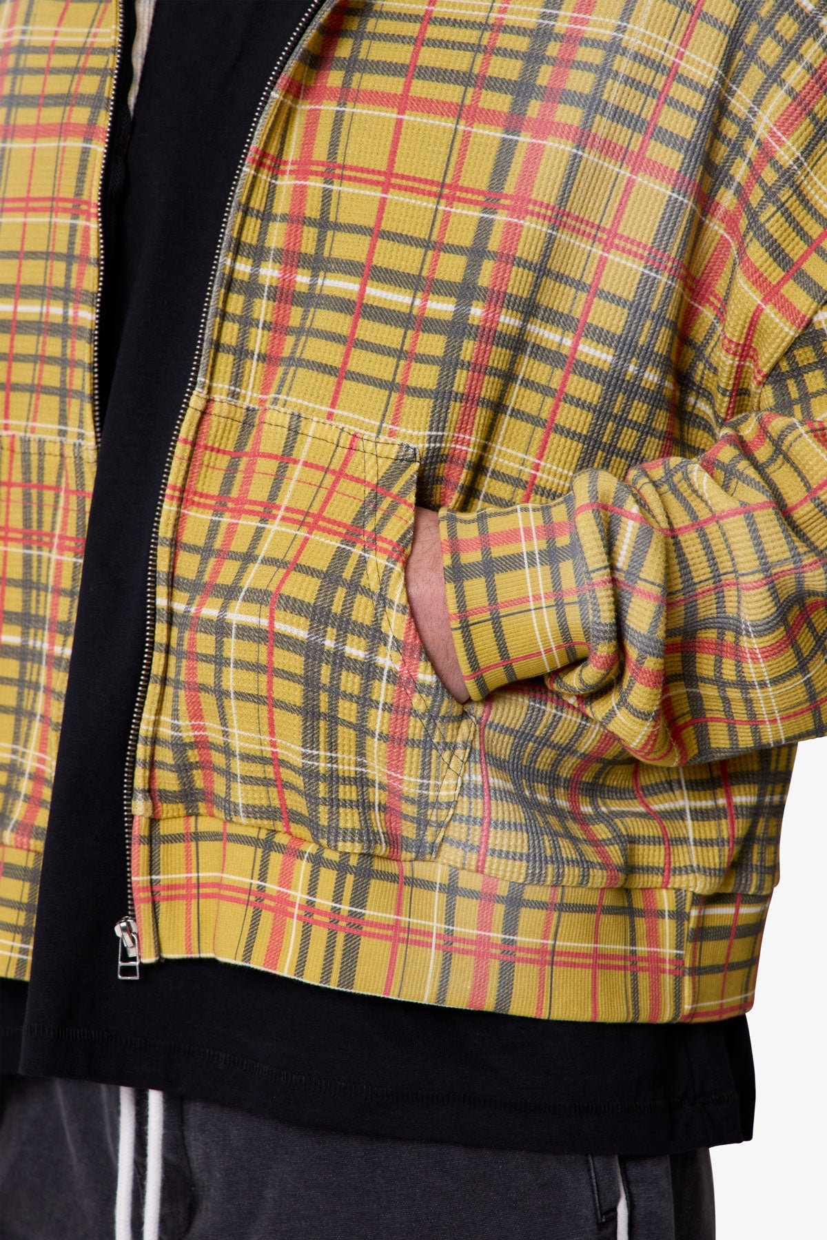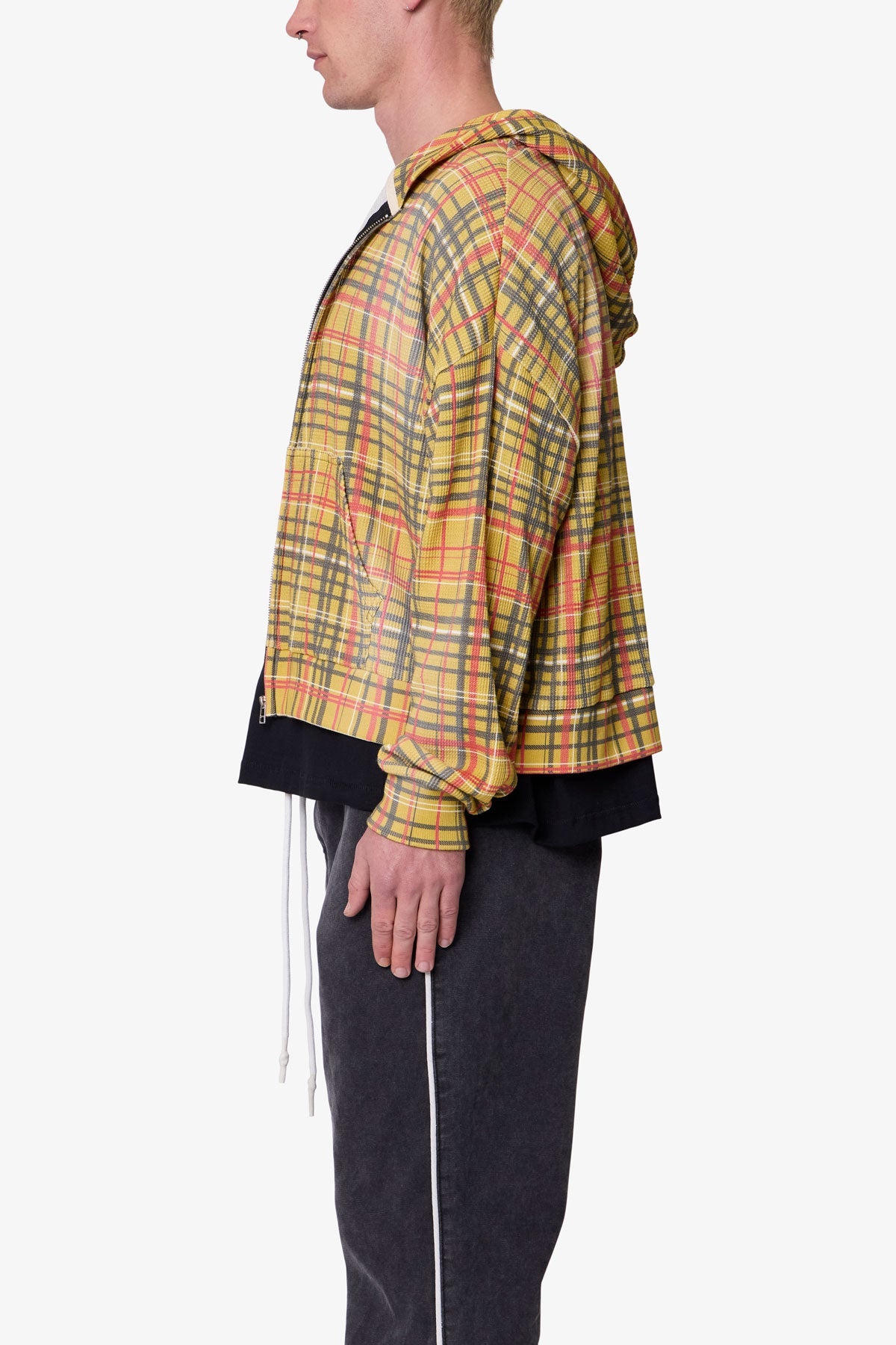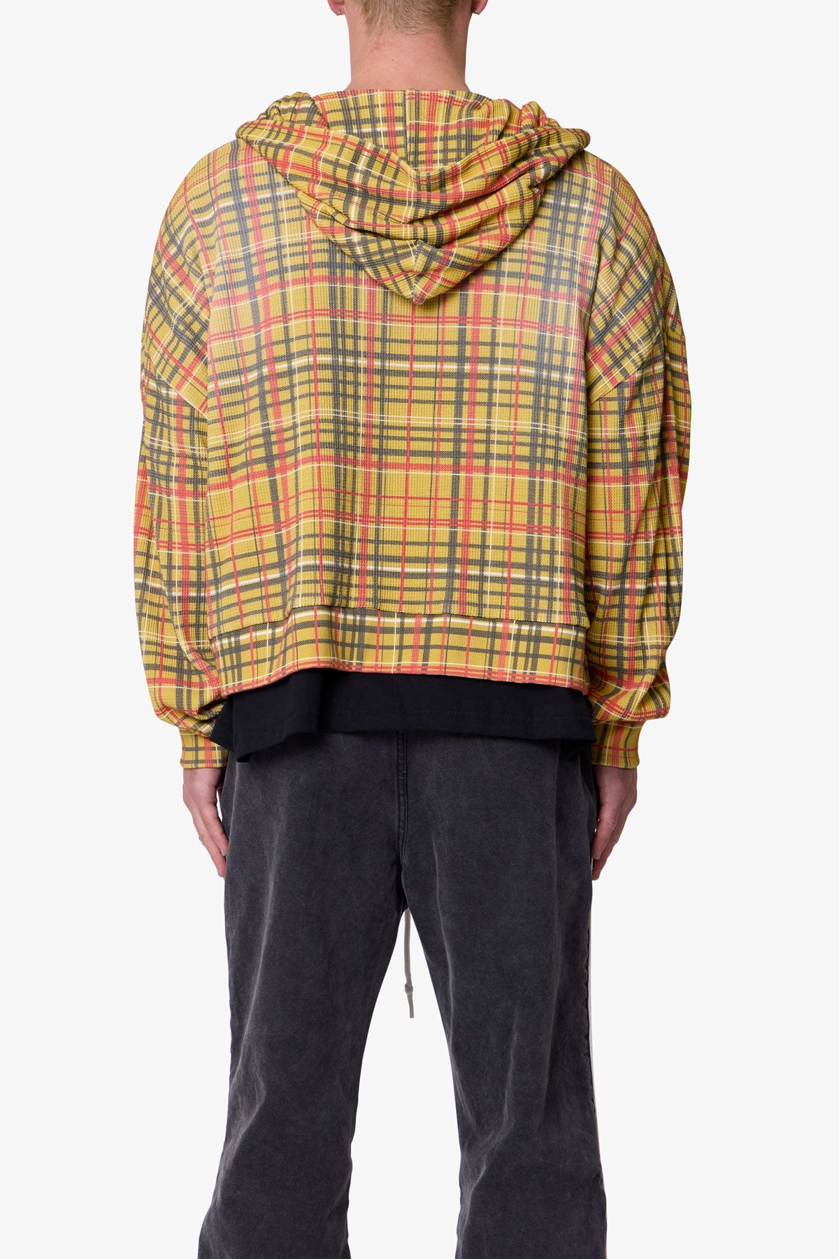 Constructed from 280 gsm cotton thermal, the Plaid Thermal Hoodie features a cropped, boxy fit with dropped shoulders and a slight crop at the waist. Designed with an all-over printed plaid graphic, this zip-up hoodie is finished with a heavy vintage wash and light pp spray for a worn-in effect and enhanced softness. Ribbed cuffs and hem provide structure, while kangaroo pockets and a full-length zipper add utility.