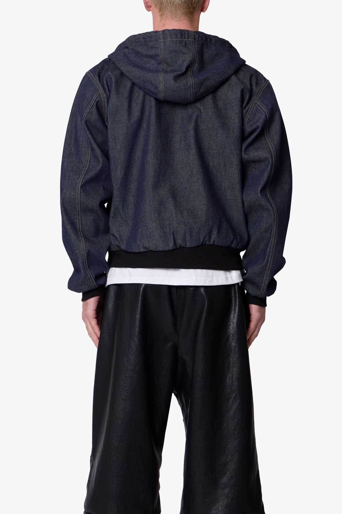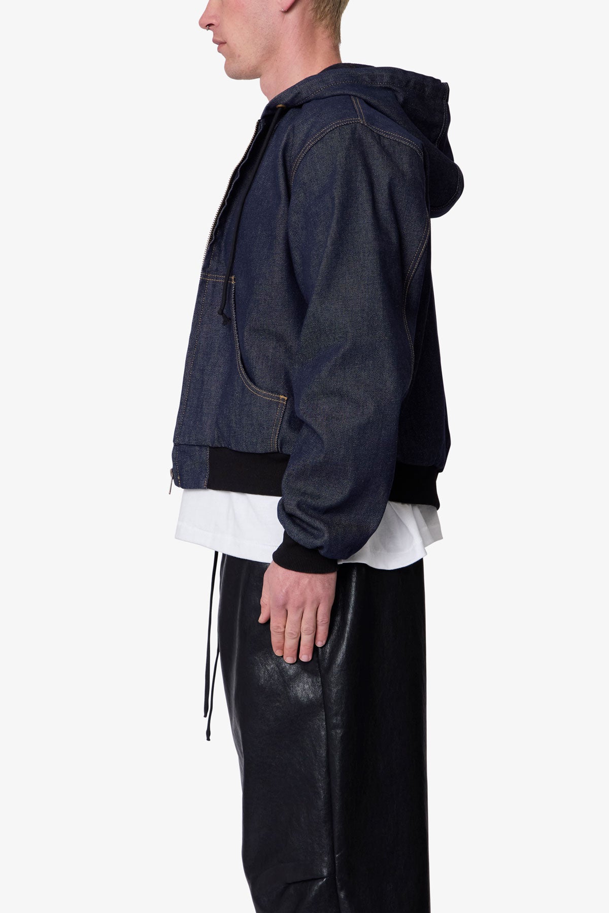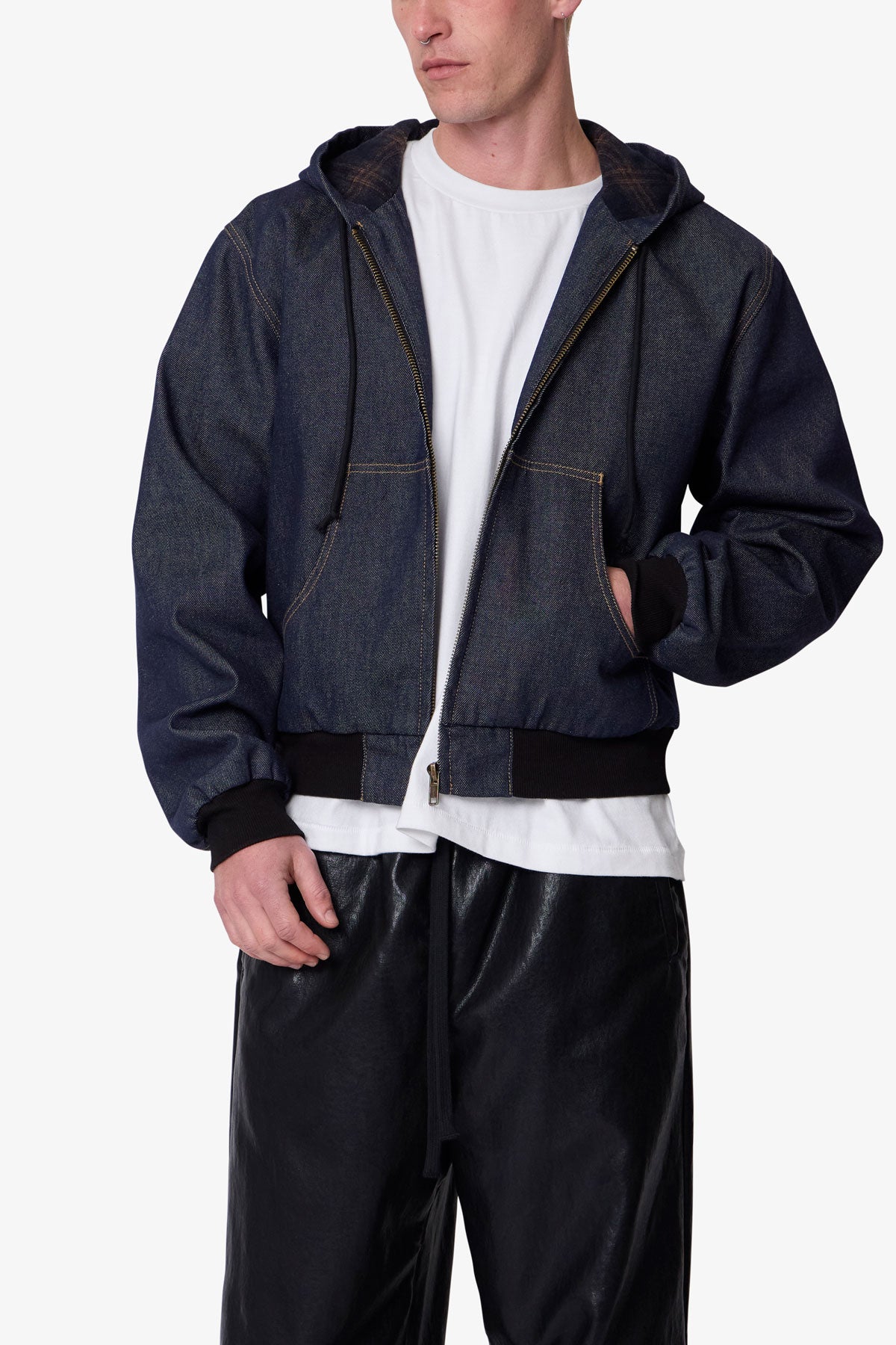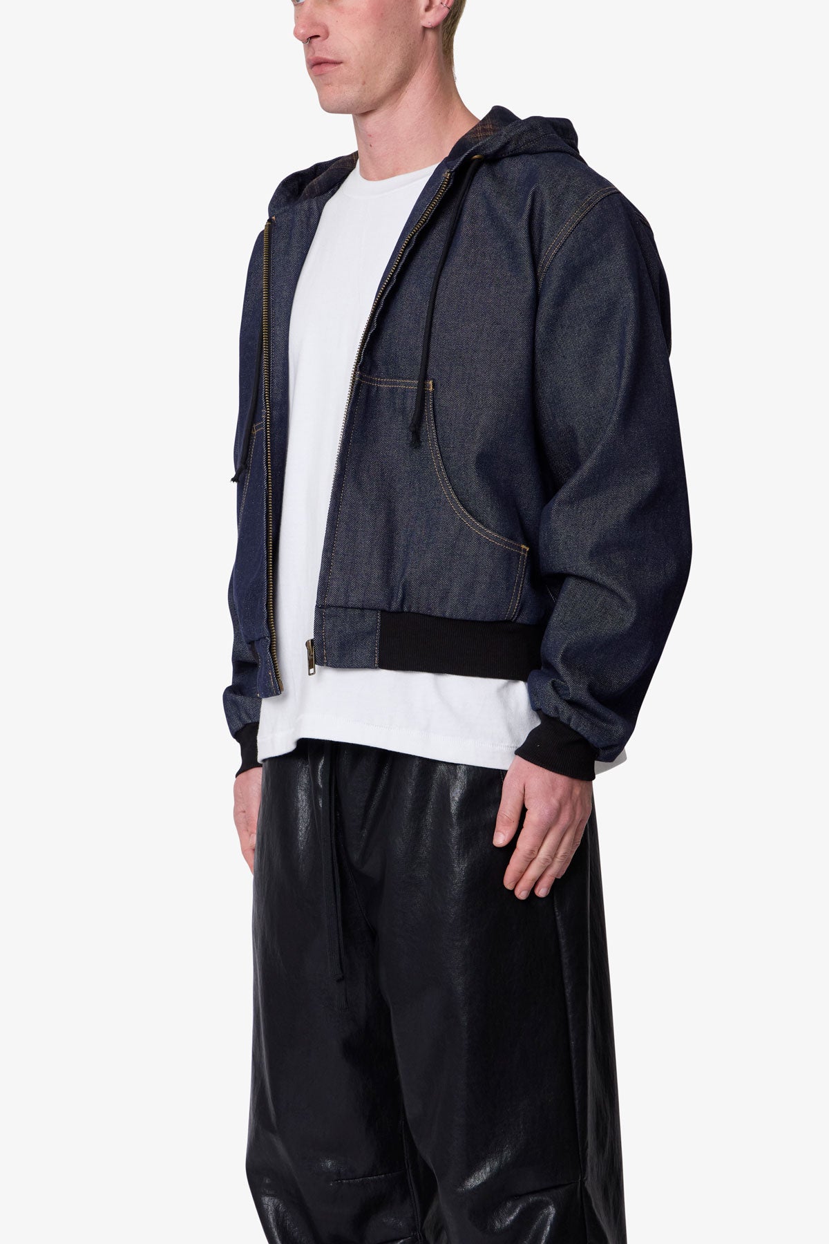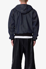 Constructed from 100% cotton denim with a rinse wash, the Raw Hooded Denim Jacket features a relaxed fit and cropped body. Designed with a full zip front closure, the jacket includes a flannel-lined hood, contrast gold stitching, and kangaroo pockets. Finished with ribbed hem and sleeve cuffs, and an adjustable drawcord at the hood.