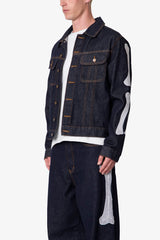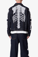 Constructed from rinse-washed denim, the Raw Skeleton Trucker Jacket features a standard fit and classic trucker silhouette. Designed with skeleton chain stitch patch appliques along both sleeves, it includes flapped chest pockets, a standard collar, and shank button closures throughout.