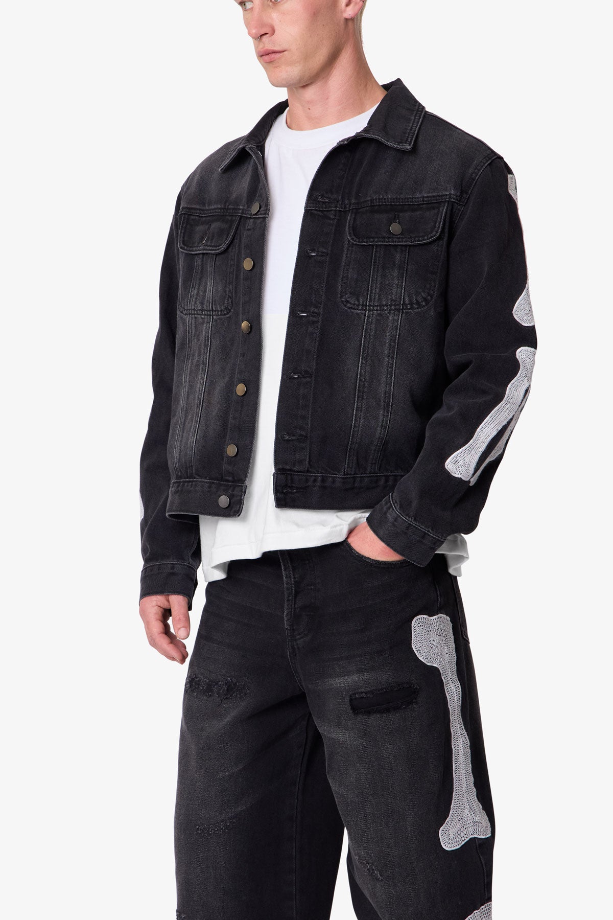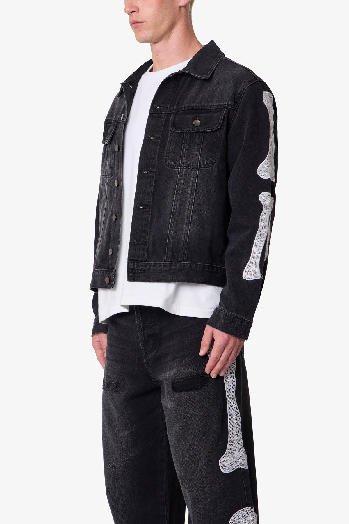 - Skeleton chain stitch patch appliques on sleeves