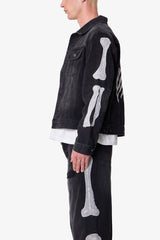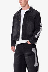 Constructed from rinse-washed denim, the Skeleton Trucker Jacket features a standard fit and classic trucker silhouette. Designed with skeleton chain stitch patch appliques along both sleeves, it includes flapped chest pockets, a standard collar, and shank button closures throughout.