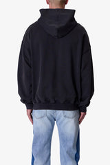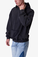 the Raw Stitch Hoodie features a relaxed fit with a dropped shoulder design, front pouch pocket, ribbing at the wrists and waist, exposed seam details throughout, and finished in a washed and brushed fleece fabric.