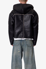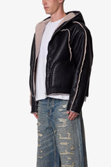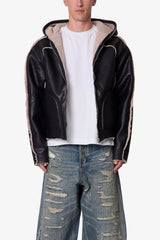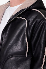 The Shearling Lined Jacket is a relaxed faux leather outerwear piece constructed from 100% polyurethane. Designed with a hood and fully lined in faux shearling, it features panel detailing with visible contrast shearling and embossed leather ribbing at the hem and sleeve cuffs. Finished with a front zipper closure and practical side pockets for everyday wear.