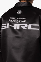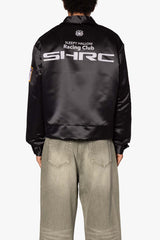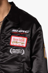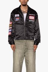 the SHRC Mechanics Jacket is designed in a custom developed polyester satin fabric and features welt pockets at the waist, zipper placket, and finished a mix of patchwork, screenprints, and embroidery throughout.