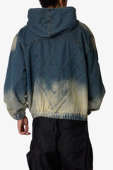 the Sludge Denim Quarter Zip Jacket is designed with a relaxed fit that is constructed from a washed cotton denim with spray details throughout, a quarter length zipper placket, kangaroo pocket at the front, and finished with elasticized self ribbing at the wrists and waist.