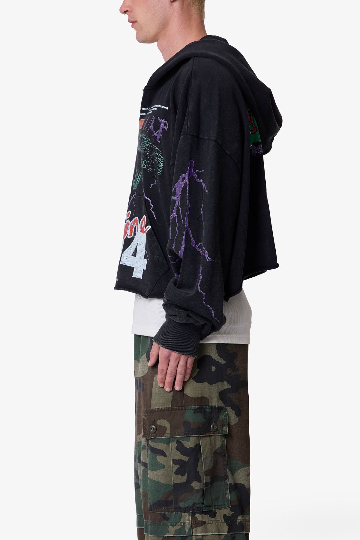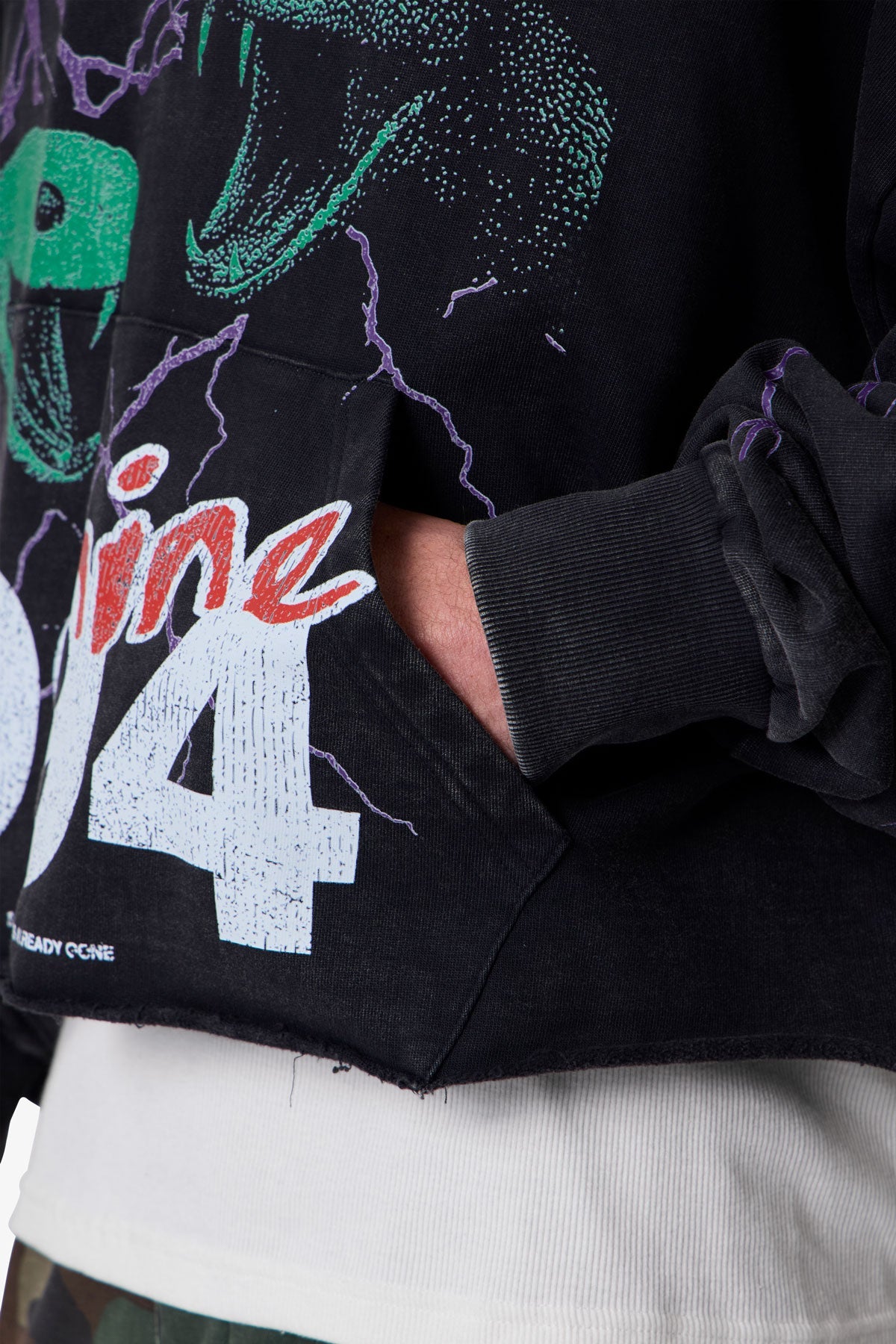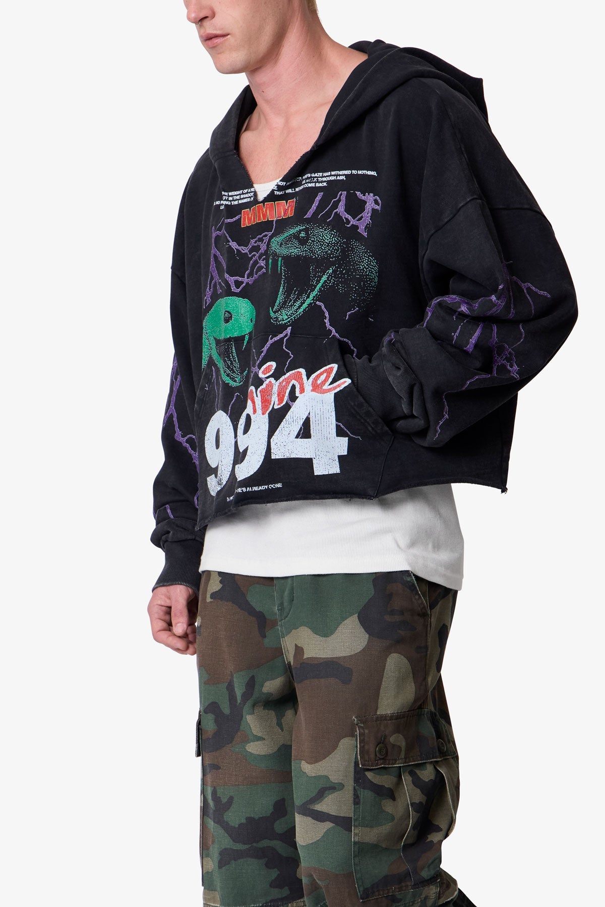 Made from 360 gsm cotton fleece with an acid wash, the Snake 994 Printed Hoodie features a relaxed, cropped silhouette with a cut-out v notch and raw hem. Designed with screen-printed graphics on the front, back, and sleeves, the garment is washed post-printing to achieve a lightly distressed, vintage appearance.