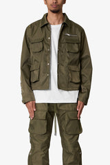 the Snap Cargo Work Jacket is designed with a classic fit, button placket, snap and zipper placket, cargo pockets on the wearer's front, and finished in a stiff nylon fabric.