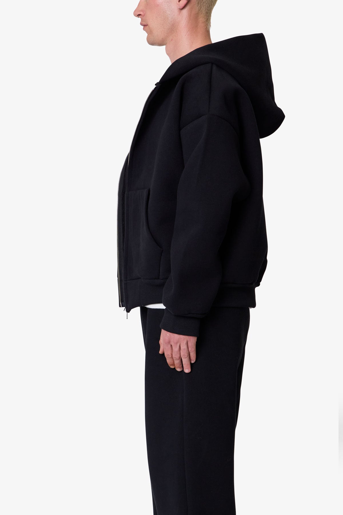 Constructed from a poly-cotton blend fused with polymide for a neoprene-like handfeel, the Stiff Lounge Zip Up Hoodie features a relaxed silhouette with dropped shoulders. Designed with a stitchless front kangaroo pocket, zip closure, and heavy ribbing at the cuffs and hem.