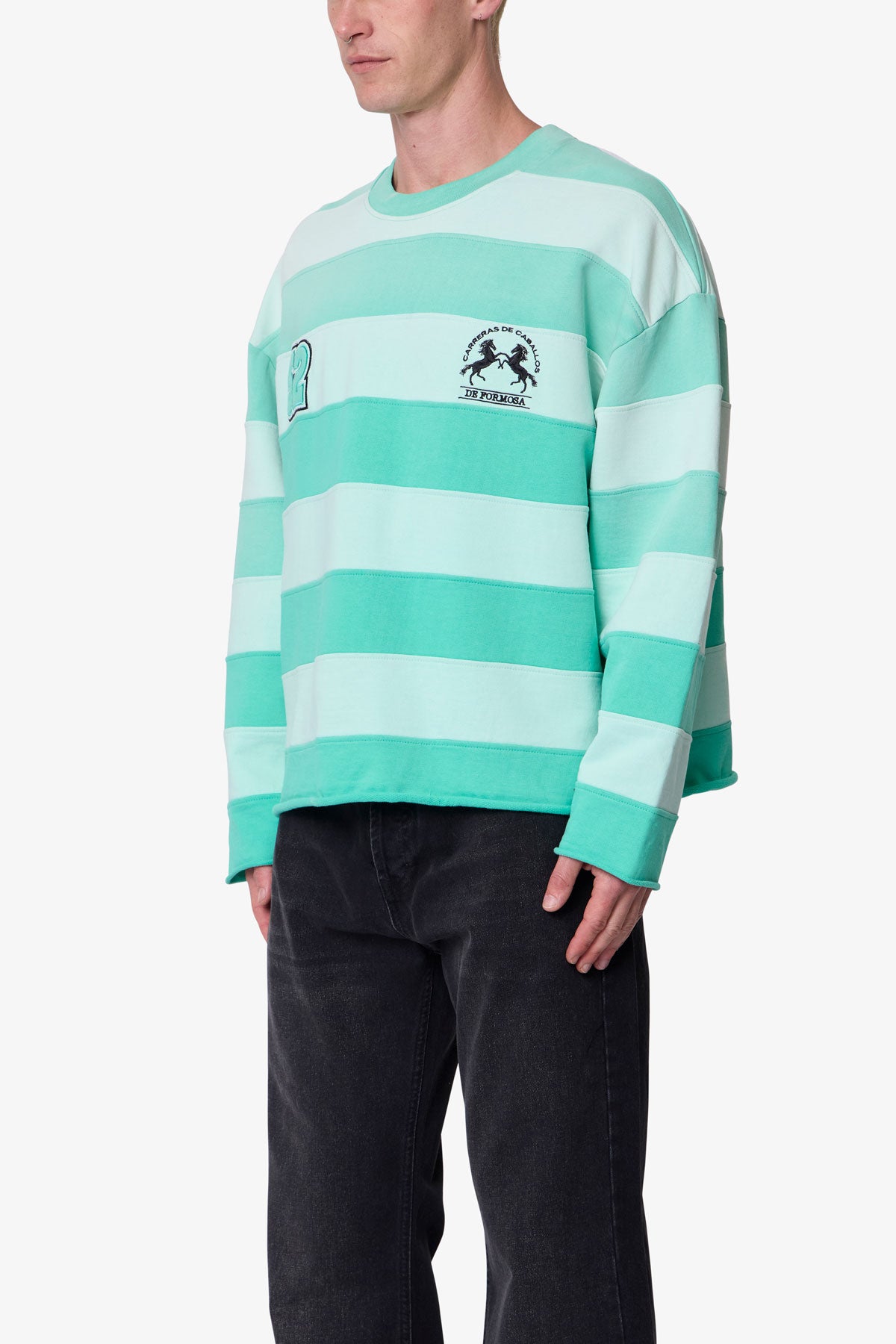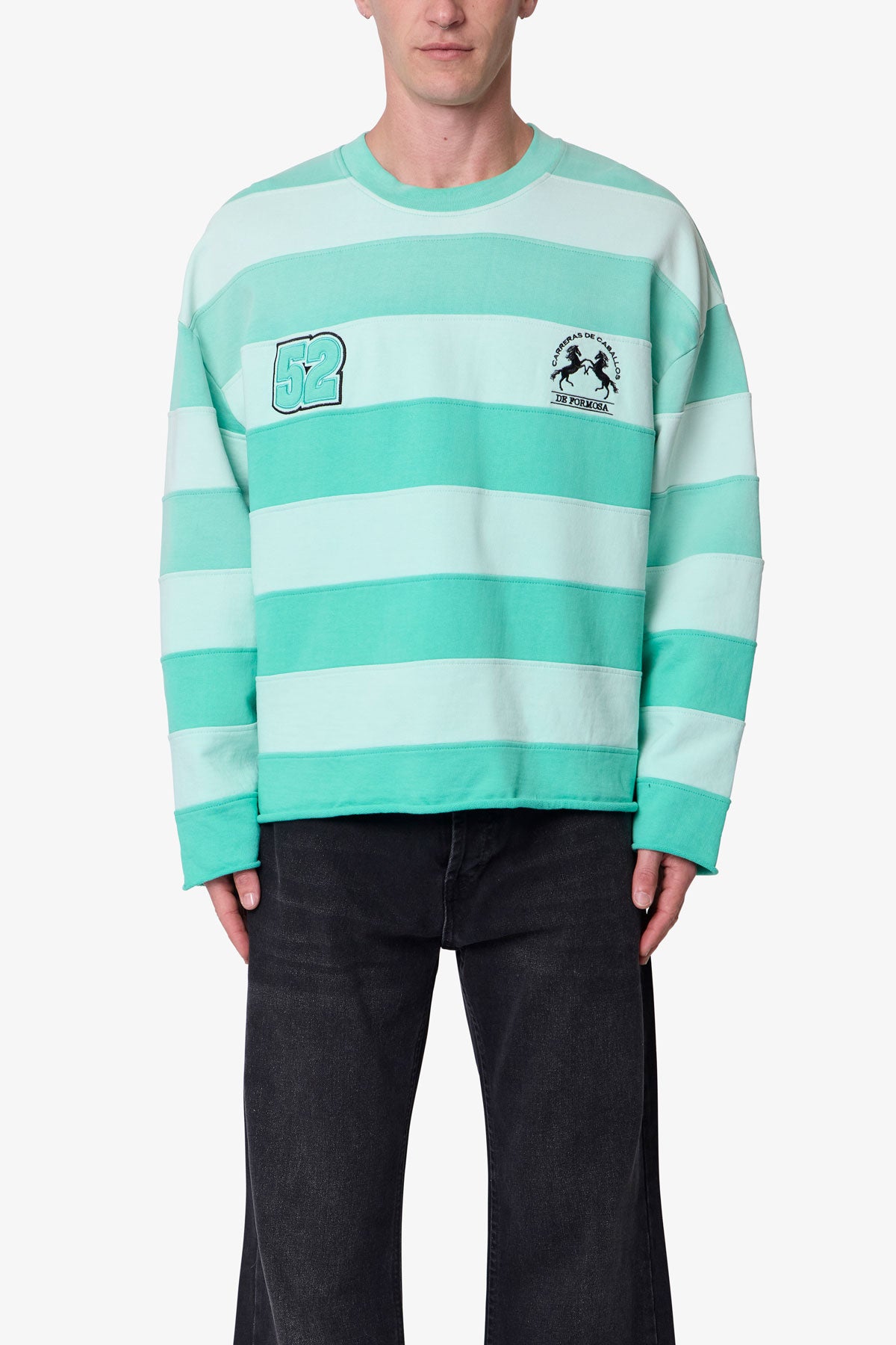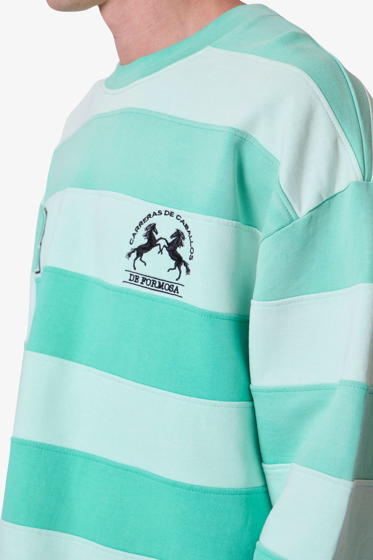Constructed from vintage-washed fleece, the Striped Crewneck Sweater features a relaxed silhouette with dropped shoulders and knit stripe detailing. Designed with an ombre PP spray finish for a sun-faded appearance, it includes raw hem and sleeve openings, embroidered jersey numbers on the chest and back, and an embroidered horse motif on the chest. Finished with a ribbed crew neckline.
