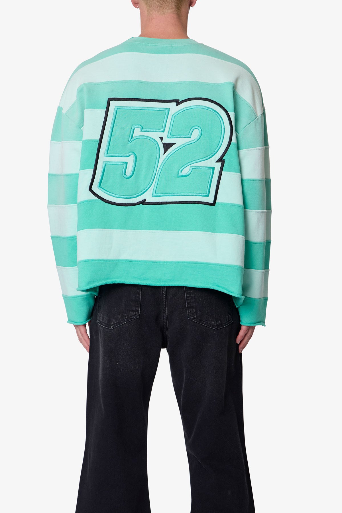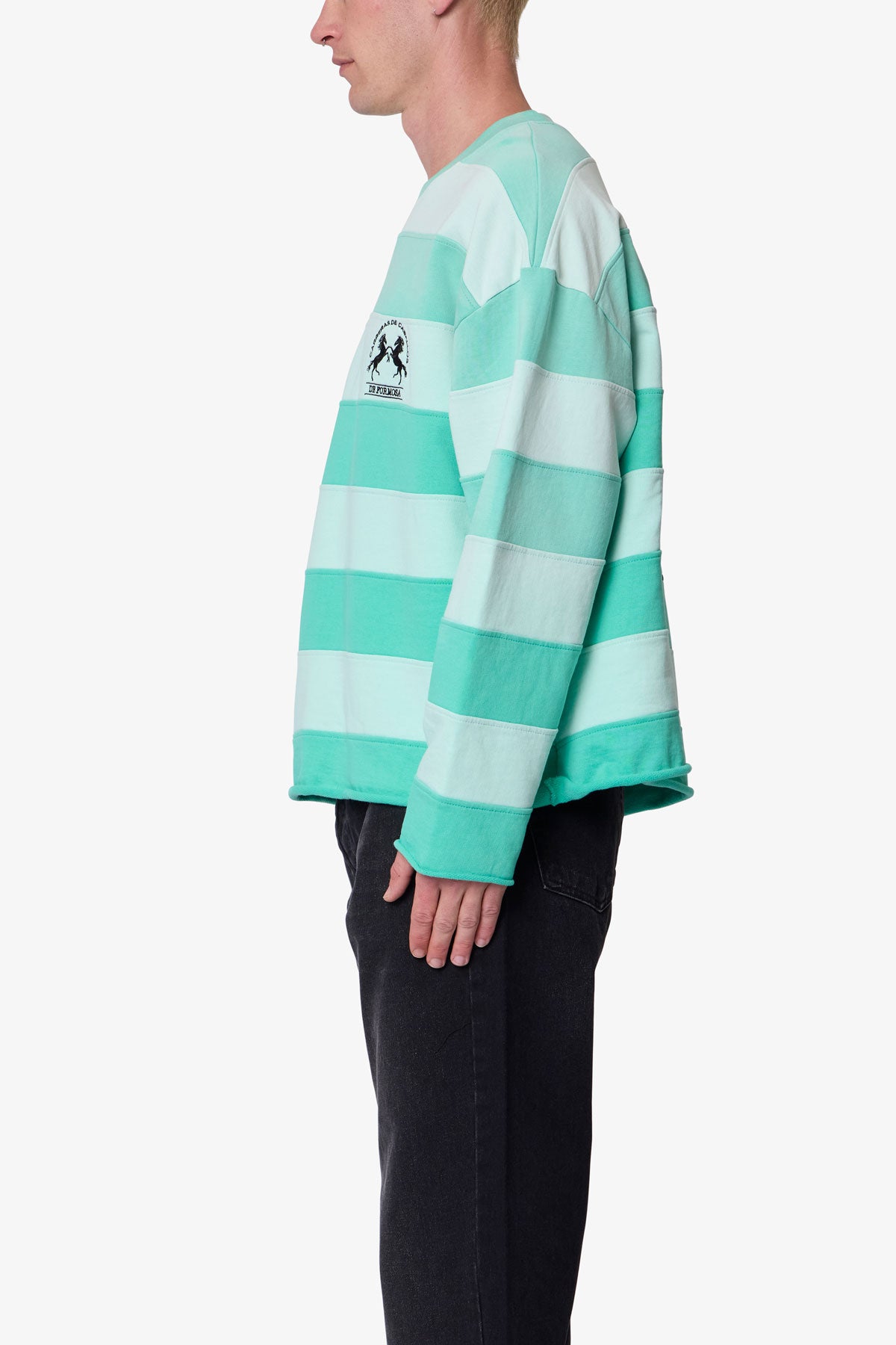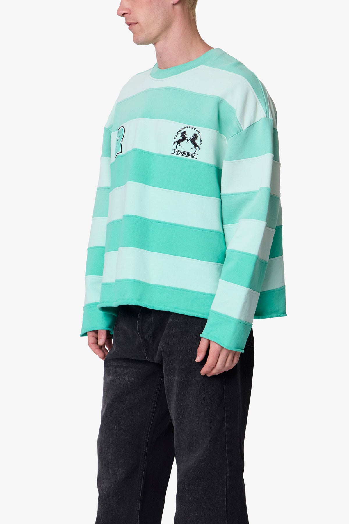 Constructed from vintage-washed fleece, the Striped Crewneck Sweater features a relaxed silhouette with dropped shoulders and knit stripe detailing. Designed with an ombre PP spray finish for a sun-faded appearance, it includes raw hem and sleeve openings, embroidered jersey numbers on the chest and back, and an embroidered horse motif on the chest. Finished with a ribbed crew neckline.