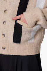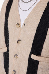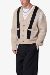 Constructed from a faux mohair knit, the Striped Mohair Cardigan Sweater features a relaxed silhouette with a wide chest and slightly cropped body. Designed with vertical contrasting stripes, it includes a v neckline, large tortoise shell buttons, and two front welt pockets. Finished with ribbed knit sleeve cuffs and bottom hem.