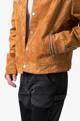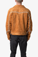 Part of our Heritage Collection, the Suede Collared Jacket is designed with a standard fit and features a classic cut and details, snaps on the placket, stud details throughout on edges and the collar, contrasting self piping details, and finished all in a faux suede fabric.