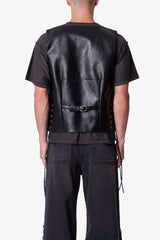 Constructed from black faux leather, the Vintage Biker Vest features a V-neck opening and front zipper closure with a snap-button placket. Designed with angled front seam pockets and lace-up detailing on both sides, it offers an adjustable fit with minimal hardware detailing.