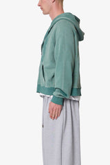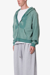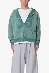 Constructed from 450 gsm French terry and treated with a heavy enzyme wash, the Vintage Raglan Zip Up Hoodie features a cropped, boxy silhouette with raglan sleeves. Designed with ghost patch jersey numbers at the front and back and an additional ghost patch on the sleeve. Finished with a full-length zipper, kangaroo pockets, and ribbed cuffs and hem.