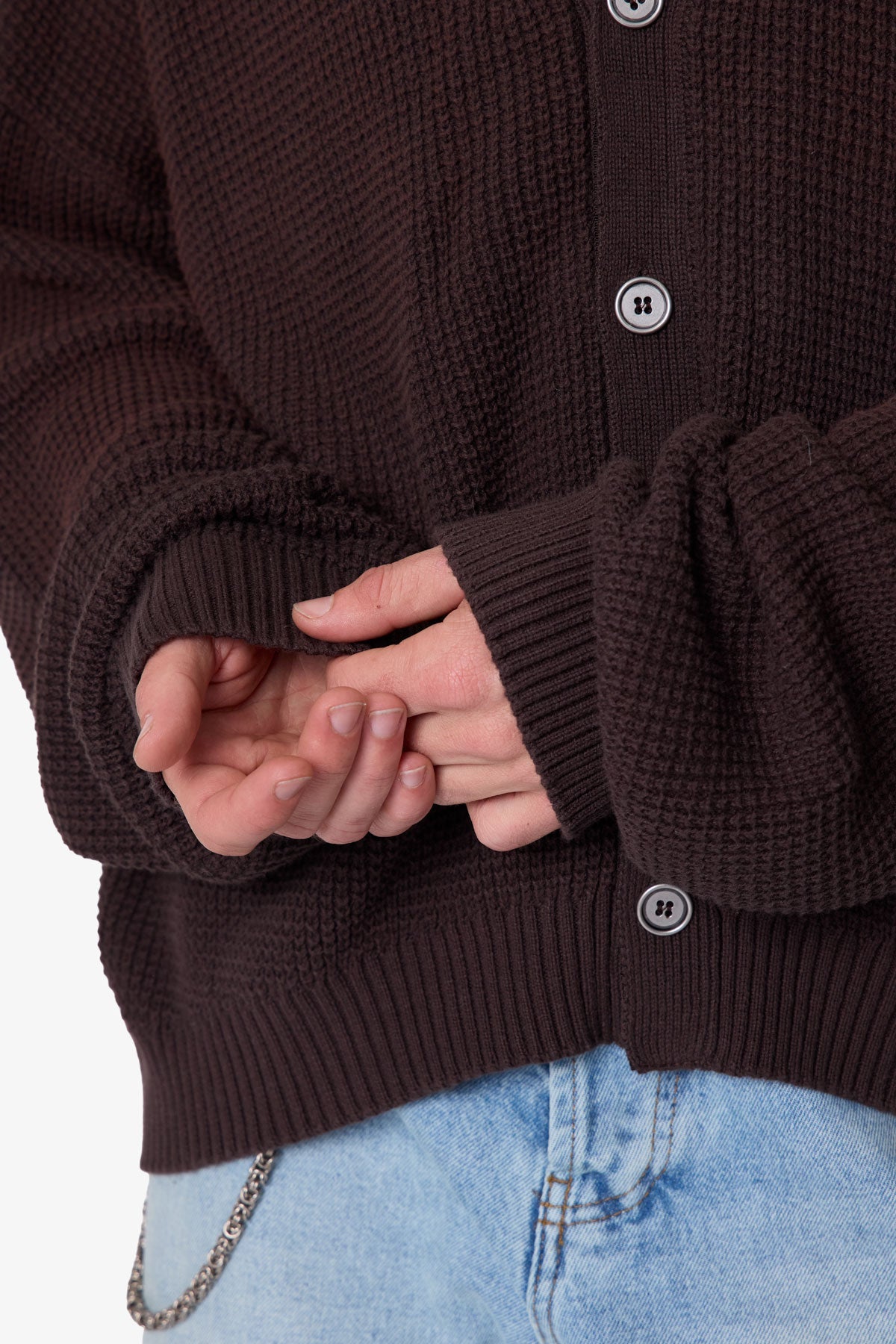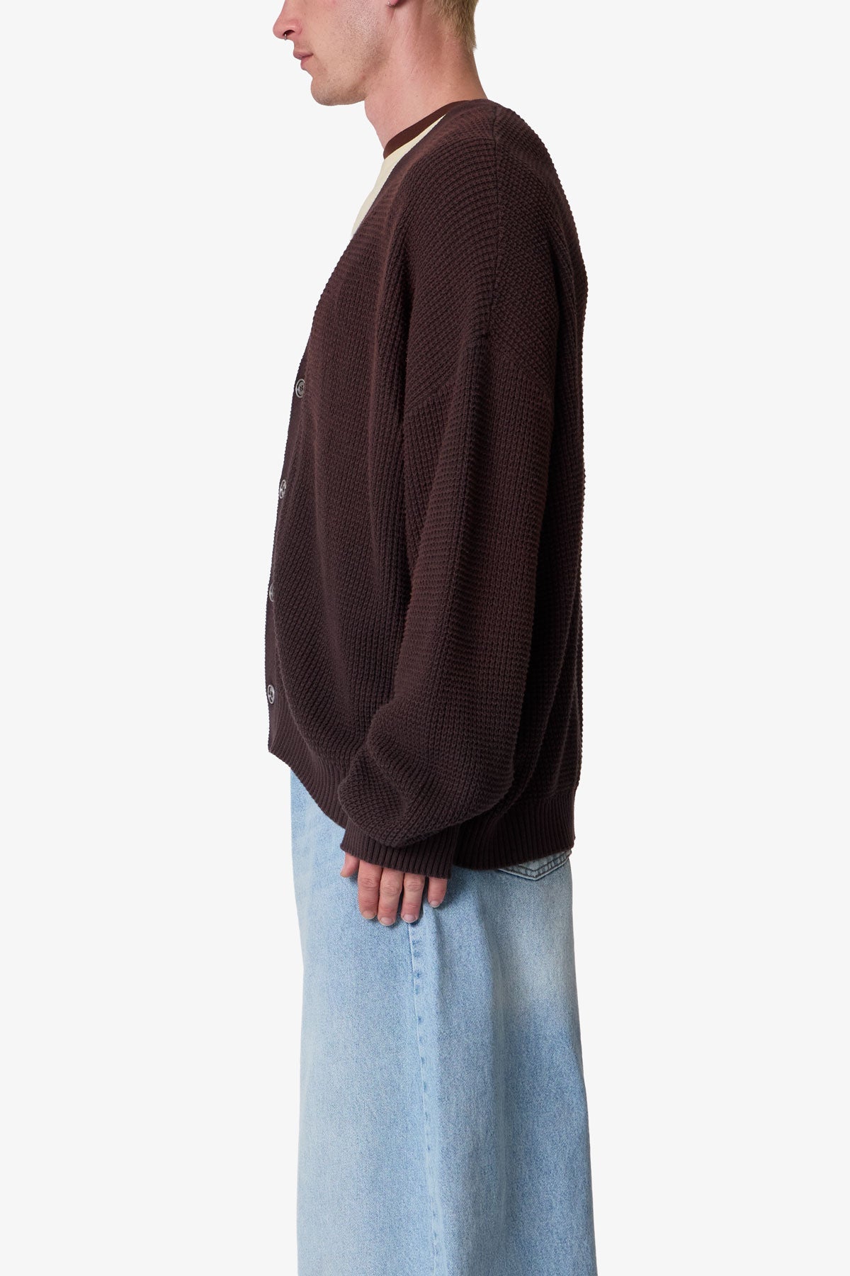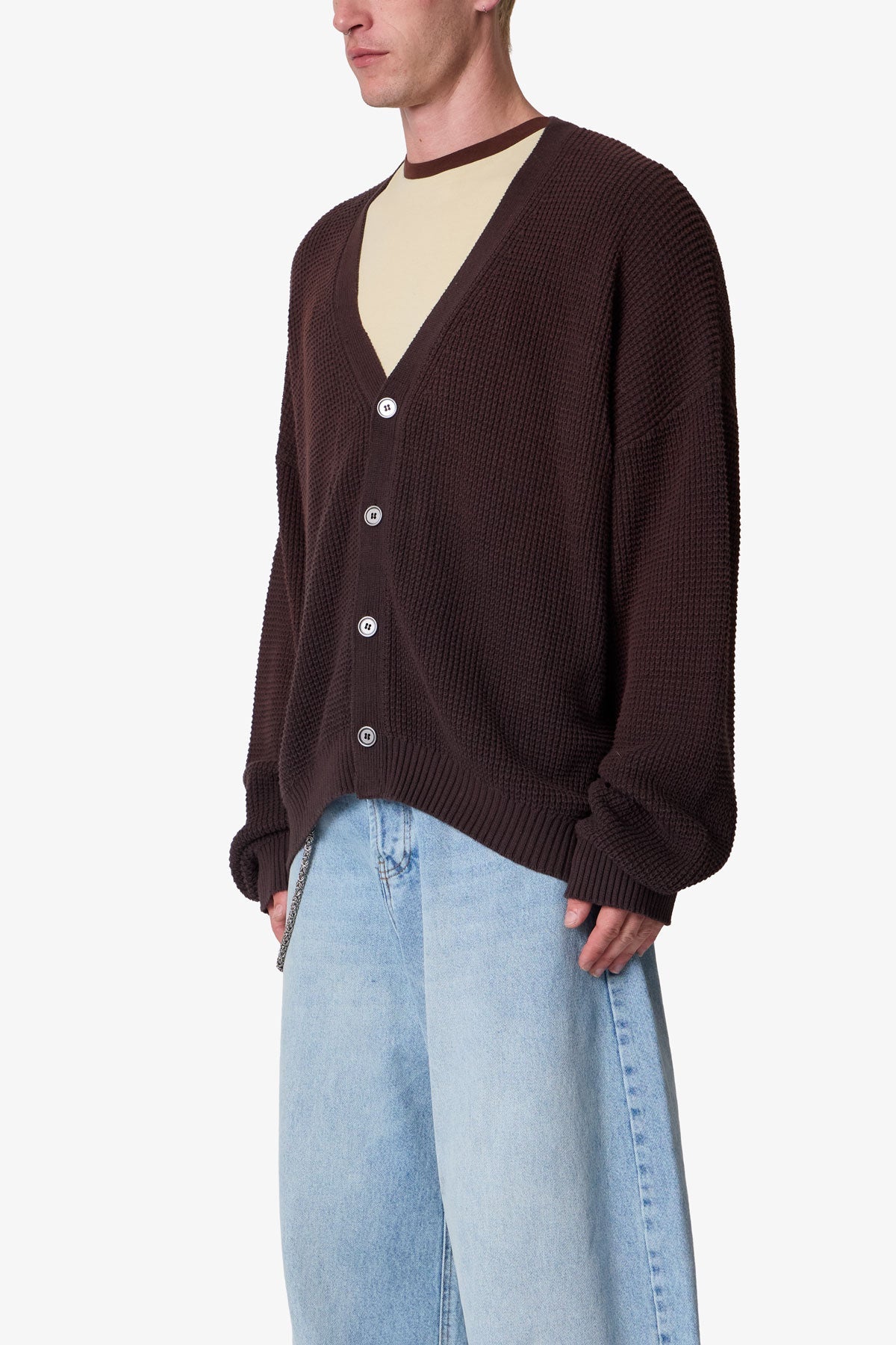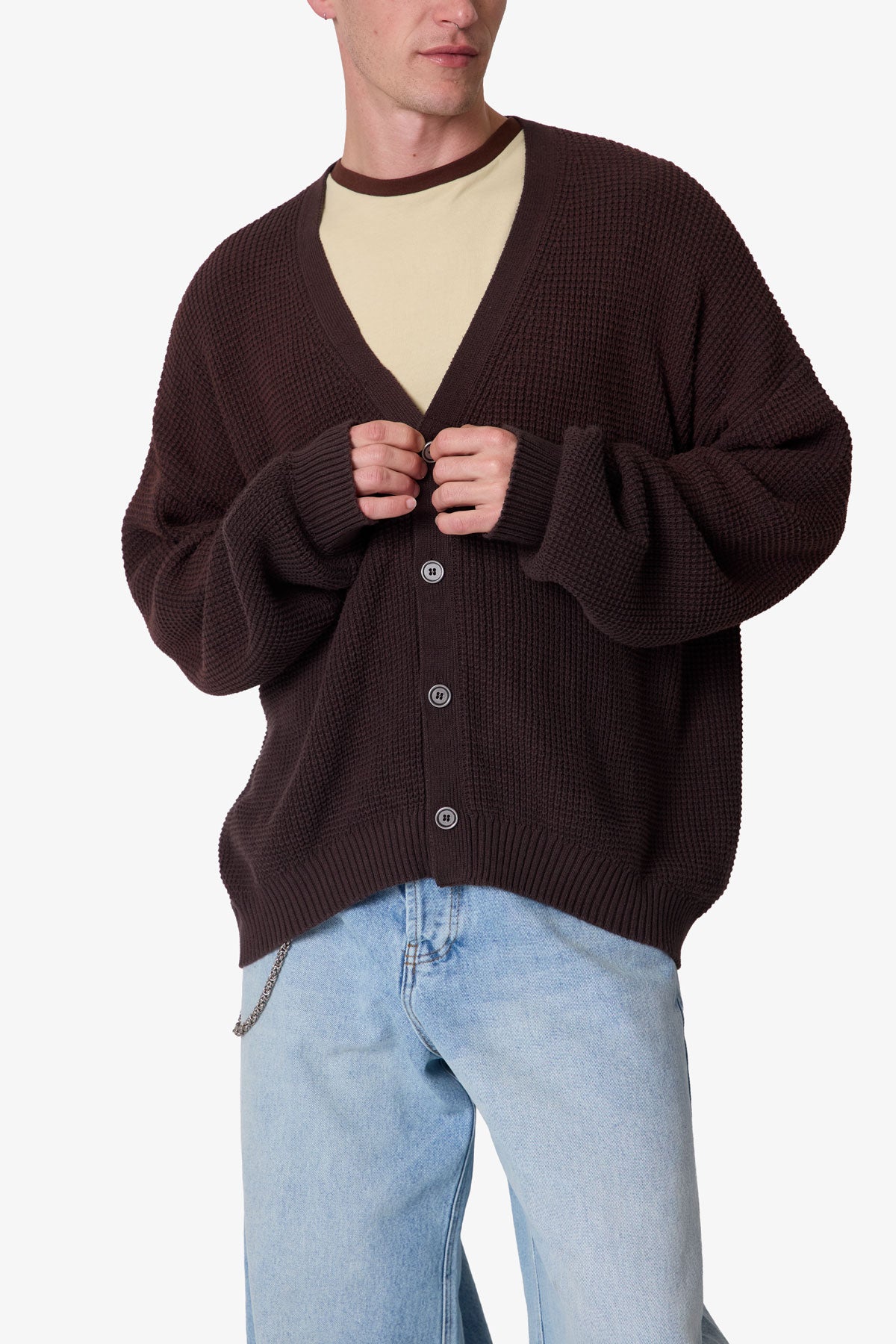 Constructed from 100% cotton in a textured waffle knit, the Waffle Cardigan Sweater is designed with a relaxed fit and dropped shoulders. Features include a ribbed V-neckline, metal button placket, and ribbed sleeve cuffs and hem for structure. Finished with a casual silhouette for easy layering.