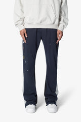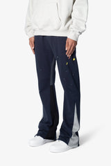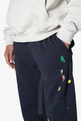 the Contrast Bootcut Sweatpants are designed with a relaxed fit throughout, featuring an elasticized self waist and leg opening, multi-colored paint splatter throughout, and finished with denim and contrasting panels at the inseam and outseam to provide a flare at the leg opening.