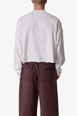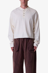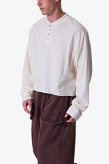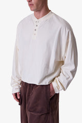 the Button Fastened Oversized L/S Tee features a relaxed fit with a dropped shoulder design, standard hem detail at the wrists, raw edge at the bottom opening, a button placket at the neck, and is finished in a garment washed cotton fabric.
