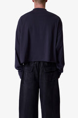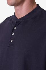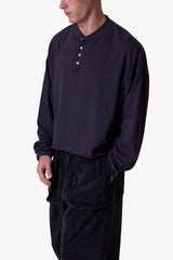 the Button Fastened Oversized L/S Tee features a relaxed fit with a dropped shoulder design, standard hem detail at the wrists, raw edge at the bottom opening, a button placket at the neck, and is finished in a garment washed cotton fabric.