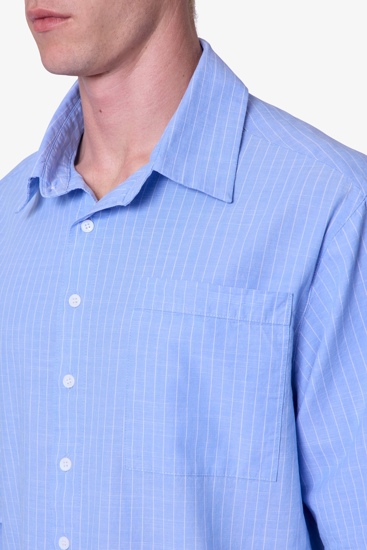 Constructed from 100% cotton with a fabric wash finish, this boxy cropped shirt is made from blue striped chambray and designed with long sleeve inserts for a double-layered look. Features include a paneled front sweep, standard back yoke, chest pocket, and front button closure with buttoned cuffs.
