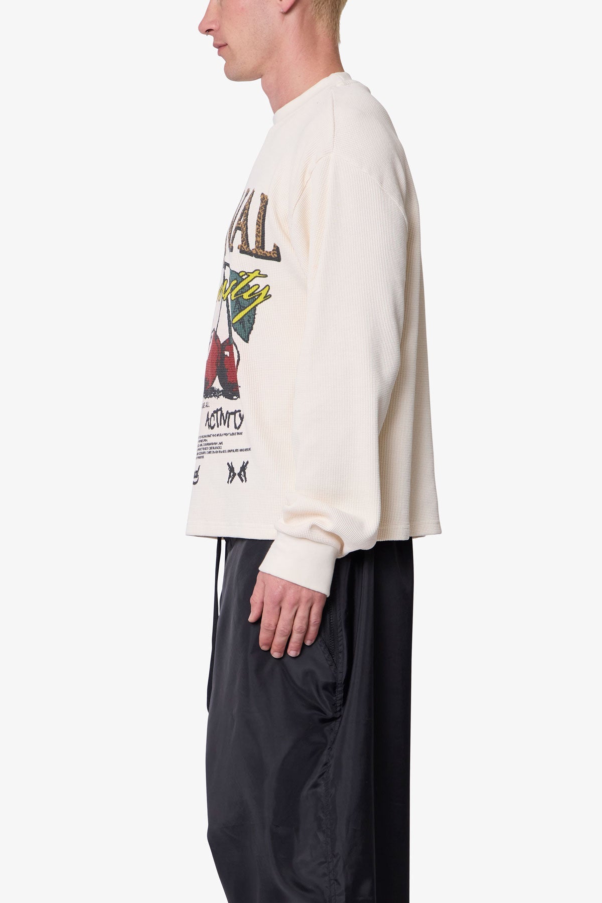 Constructed from 280 gsm cotton waffle thermal, the Criminal L/S Thermal Shirt features a relaxed fit with dropped shoulders and a vintage wash for added softness. Designed with a screen printed graphic on the front, it’s finished with ribbed cuffs, ribbed neckline, and a straight hem.