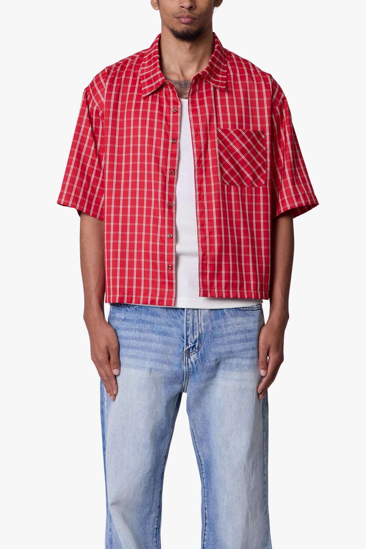 Constructed from a crisp poplin fabric, the Crispy Poplin Over Shirt features a checked plaid pattern and a cropped, boxy fit. Designed with short sleeves, a standard collar, and a full front button closure, it's finished with hemmed sleeves and a clean hem.