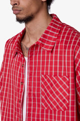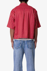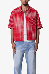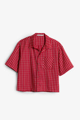 Constructed from a crisp cotton-blend poplin, this cropped overshirt features a boxy silhouette and short, wide sleeves. Designed with a classic spread collar, front button closure, and a single patch pocket at the chest. Finished with a straight hem.
