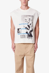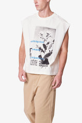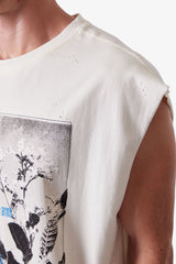 Constructed from 100% cotton with a vintage wash, the Distressed Sleeveless Tank features a wide, cropped fit with raw armholes and a finished hem. Designed with screen printed artwork on the front and back, the graphics are intentionally cracked for a distressed, worn-in appearance.