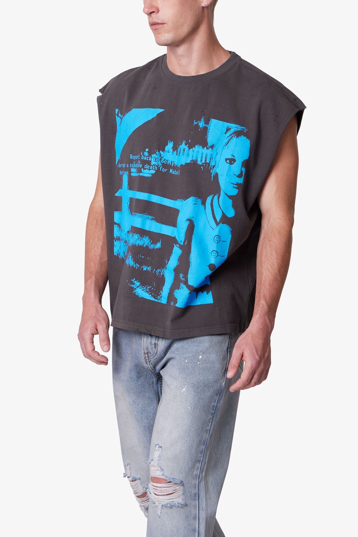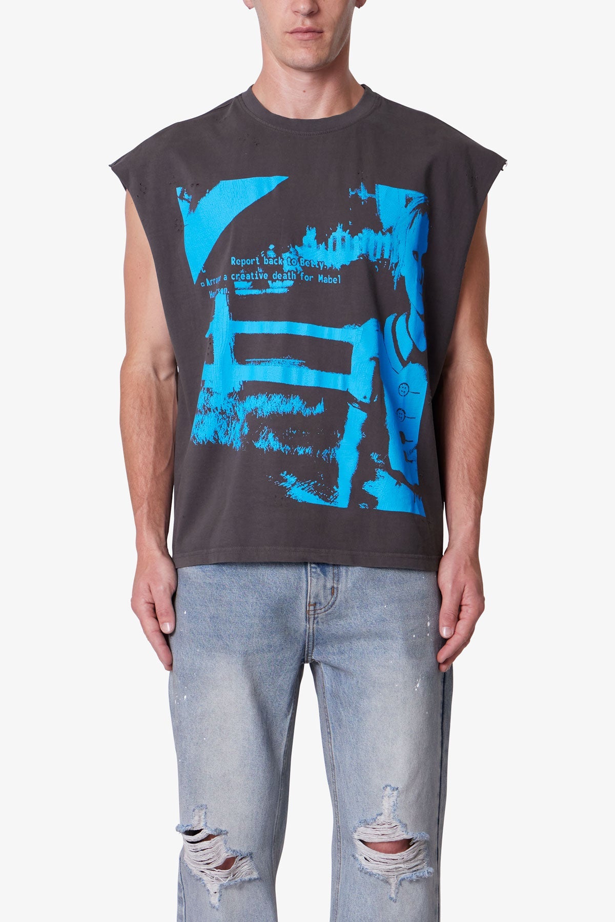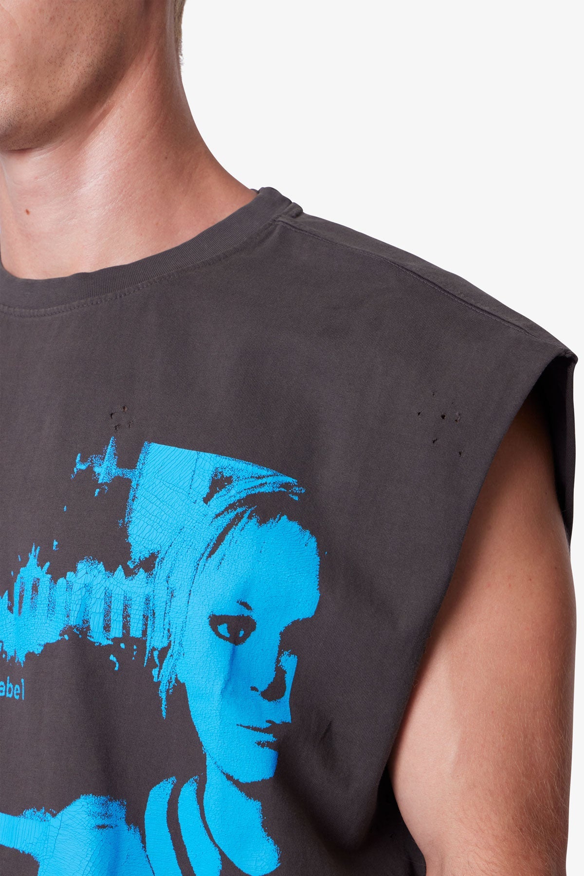 Constructed from 100% cotton with a vintage wash, the Distressed Sleeveless Tank features a wide, cropped fit with raw armholes and a finished hem. Designed with screen printed artwork on the front and back, the graphics are intentionally cracked for a distressed, worn-in appearance.
