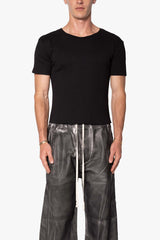 the Fitted Rib Tee is a 100% cotton tee is perfect as a base layer or worn alone. the tee features taping at the wide neck, a flat hem, and is constructed in a ribbed material