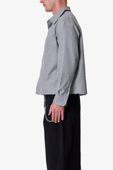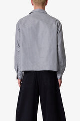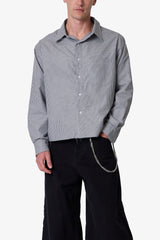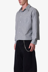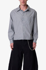 Constructed from lightweight polyester poplin with a vintage wash, the L/S Plaid Poplin Shirt features a cropped, boxy silhouette. Designed with a raw and lightly distressed hem, it includes a standard collar, front button closure, and a chest pocket. Finished with cuffed sleeves and plackets.