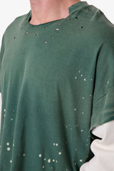Constructed from 100% cotton jersey with thermal sleeve inserts, the Layered Distressed Painted L/S Tee features a faux double-layer design with a relaxed fit. The garment is treated with a vintage wash and pp spray for a worn-in, sun-faded appearance. Finished with paint splatter details, heavy distressing throughout the upper layer, small holes along the neckline, a ripped neck rib, raw hem, and ribbed cuffs.
