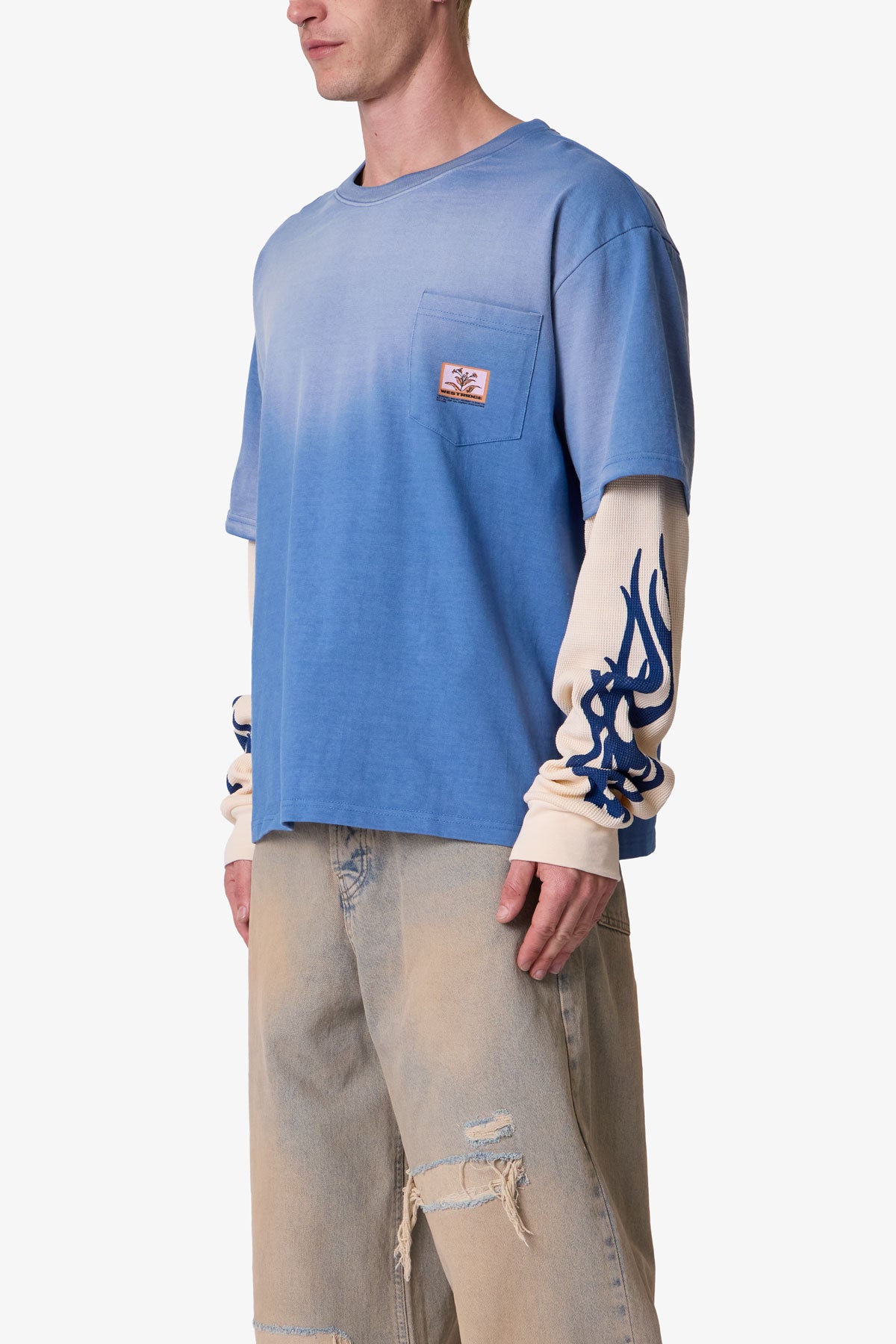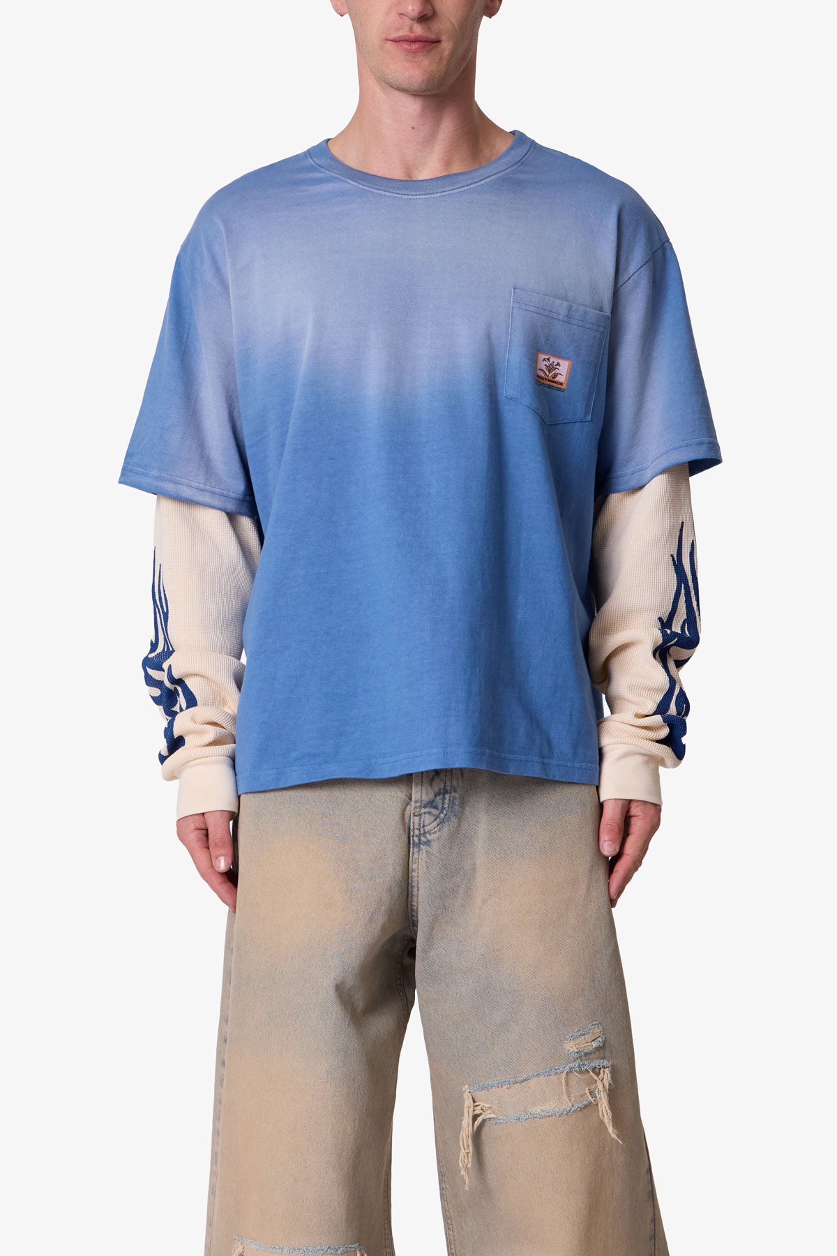 Constructed from 100% cotton jersey with thermal cotton sleeves, the Layered Flame Pocket L/S Tee features a relaxed fit and vintage-washed finish with PP spray for a worn-in effect. Designed with layered thermal long sleeves and a chest pocket with printed artwork, the sleeve print is slightly distressed due to the wash process. Finished with a ribbed neckline, ribbed sleeve cuffs, and a straight hem.