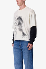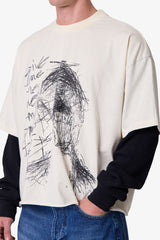 The Layered Thermal Lost S/S Tee is a cropped, relaxed fit designed for comfort. Featuring a faux double layer construction, it combines a lightweight jersey body with thermal long sleeves. The shirt is distinguished by its dropped shoulder design and a vintage wash that gives a worn effect. The front and back are adorned with screen-printed art, which gives the appearance of hand-drawn scribbles, including the word lost.
