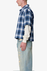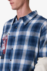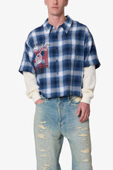 Made from a blend of 100% cotton flannel and thermal fabric, the Layered Thermal S/S Button Up Shirt features a cropped silhouette with a faux double layer design. The short plaid flannel button-up is complemented by waffle thermal long sleeves and finished with a screen printed collegiate art on the chest. A vintage wash adds a light worn effect, while the raw hem completes the look.