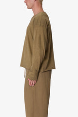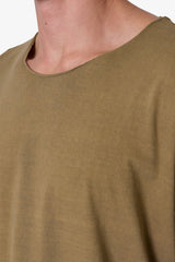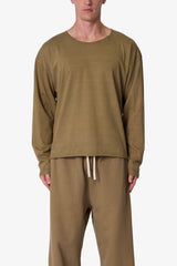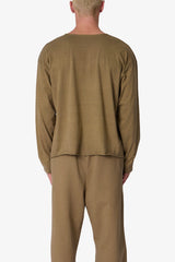 the Long Sleeve Tee features a relaxed fit with a dropped shoulder design, standard hem detail at the wrists, raw edge at the collar and bottom opening, and is finished in a garment washed cotton fabric.