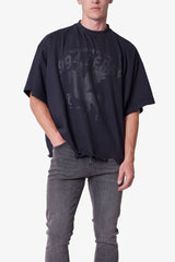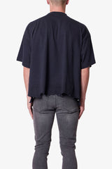 Made from 100% cotton jersey with a vintage wash, the Moth Eaten Cropped Tee features a ribbed neck. The garment also features distressing details throughout, a tonal one color screen print on the chest with cracking ink, and is finished with distressed hem and traditional sleeves.