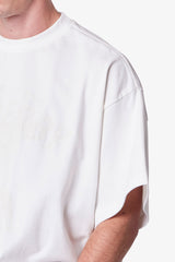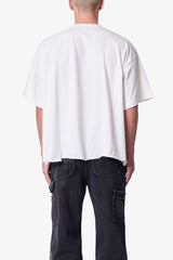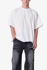 Made from 100% cotton jersey with a vintage wash, the Moth Eaten Cropped Tee features a ribbed neck. The garment also features distressing details throughout, a tonal one color screen print on the chest with cracking ink, and is finished with distressed hem and traditional sleeves.