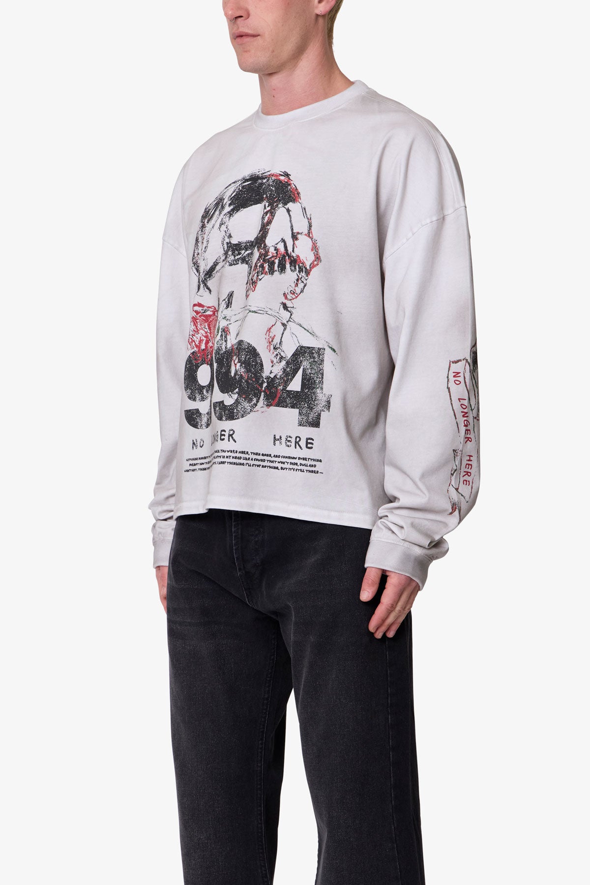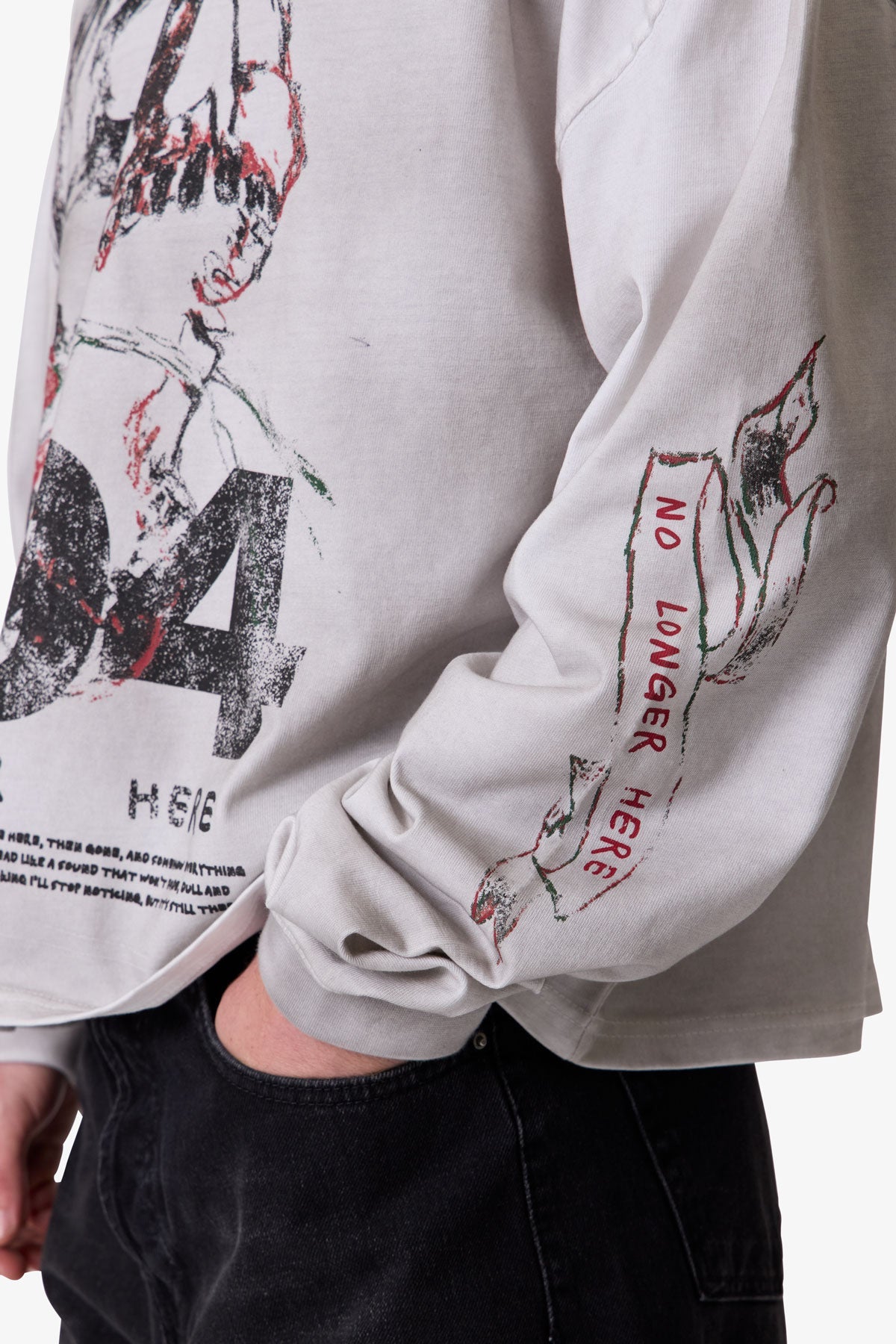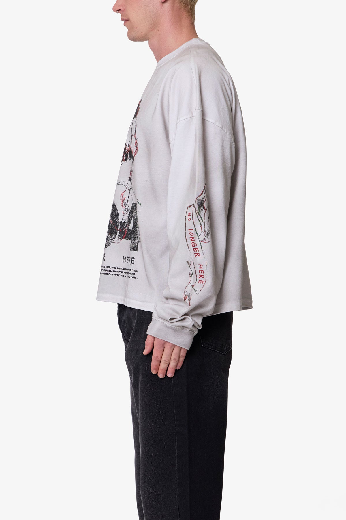 The No Longer Here L/S Tee is crafted from 100% cotton for a comfortable standard fit. It features a screen print design and is garment dyed with an enzyme wash for enhanced texture and depth.