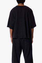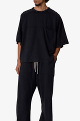 the Paneled Hidden Pocket Tee features a flat hem line and an extended shoulder seam for a relaxed, dropped shoulder fit, constructed from a washed cotton fabric, panel across the chest with an integrated pocket, and finished with an exaggerated oversized fit.