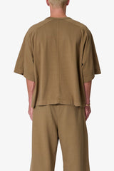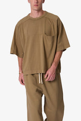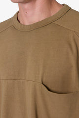 the Paneled Hidden Pocket Tee features a flat hem line and an extended shoulder seam for a relaxed, dropped shoulder fit, constructed from a washed cotton fabric, panel across the chest with an integrated pocket, and finished with an exaggerated oversized fit.